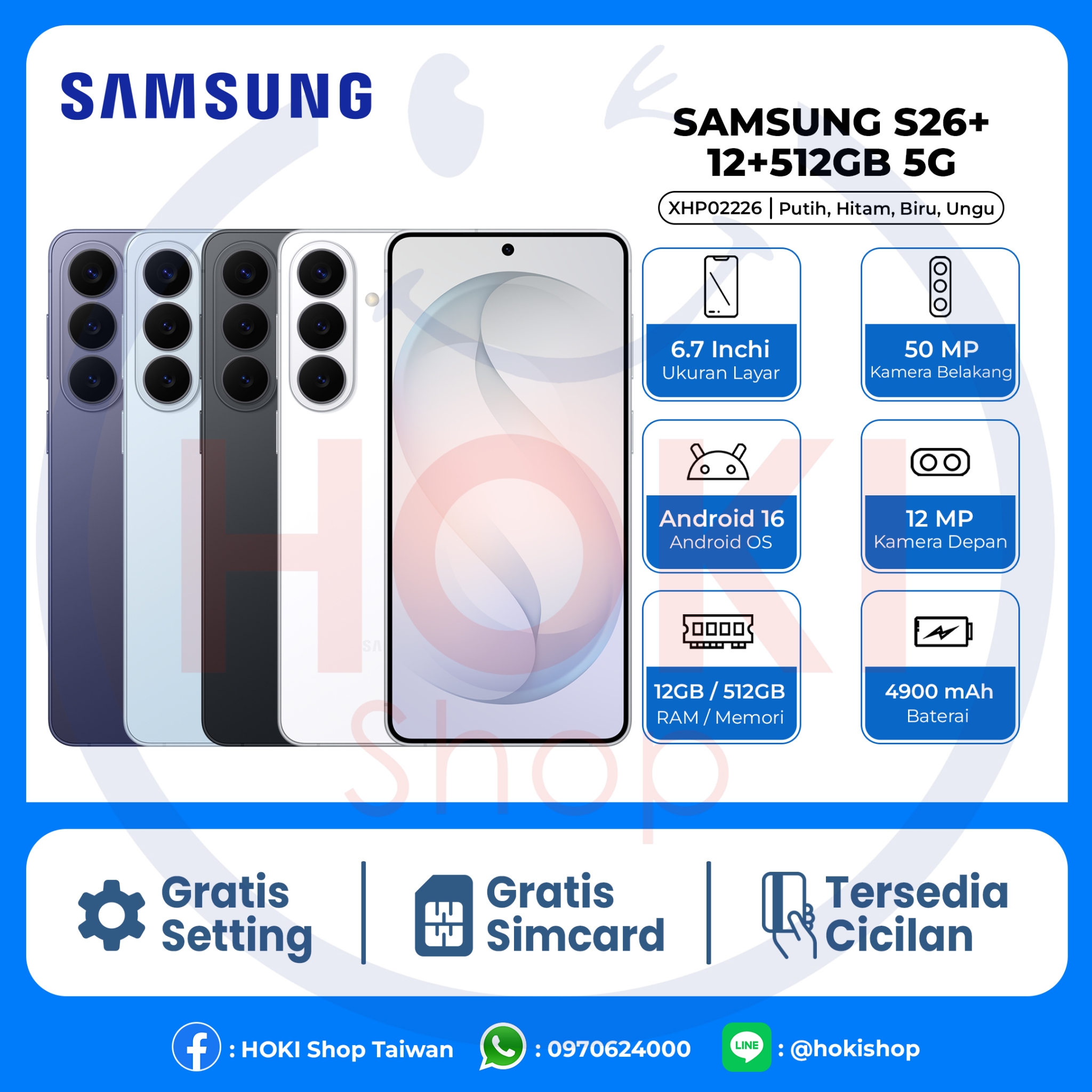 Warna : Hitam, Biru, Ungu, Putih