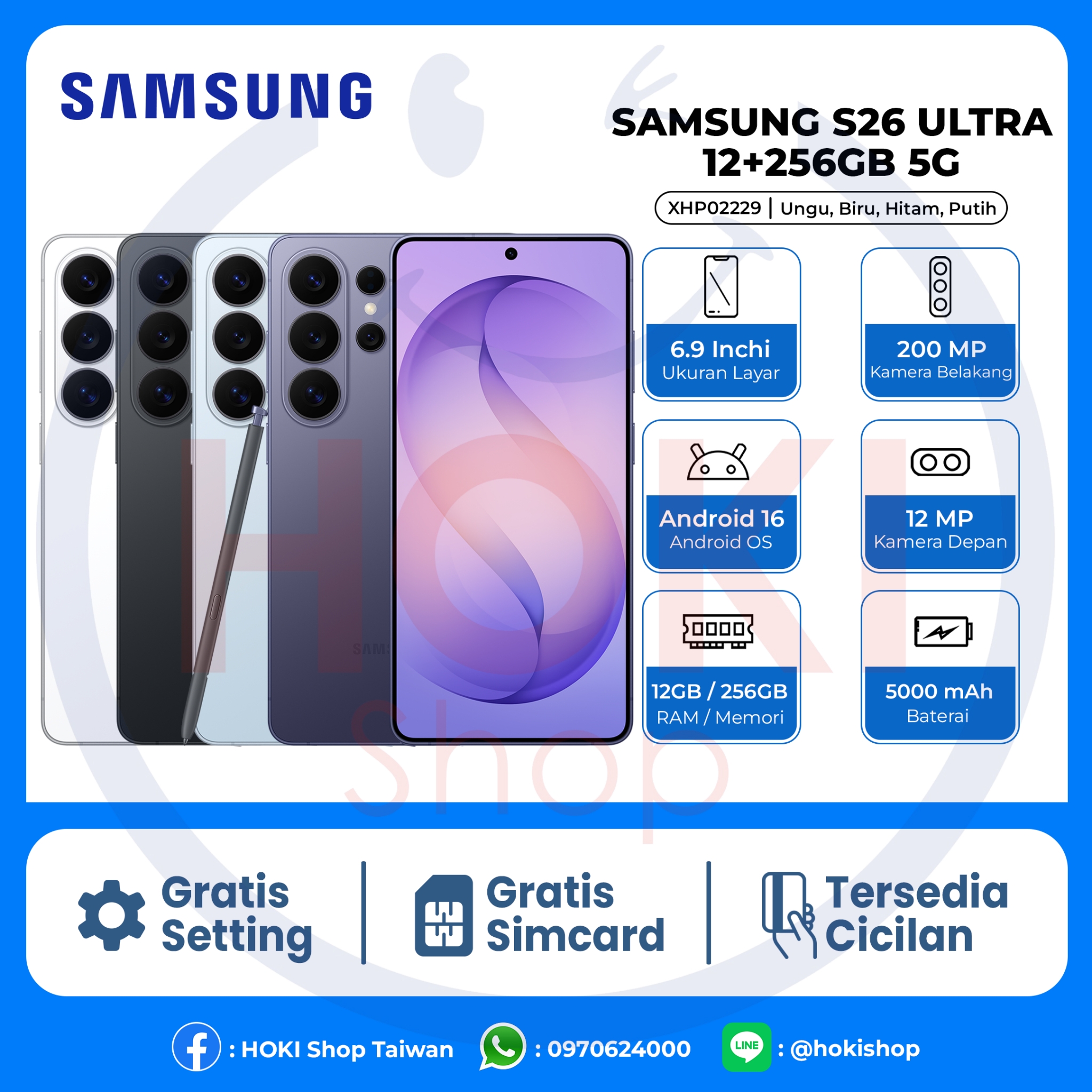 Warna : Ungu, Biru, Hitam, Putih